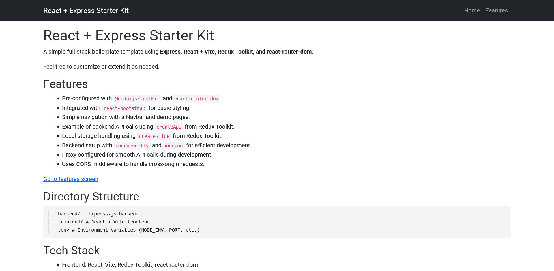 A simple full-stack boilerplate template using Express, React + Vite, Redux Toolkit, and react-router-dom. This template provides a solid foundation for developing modern web applications.